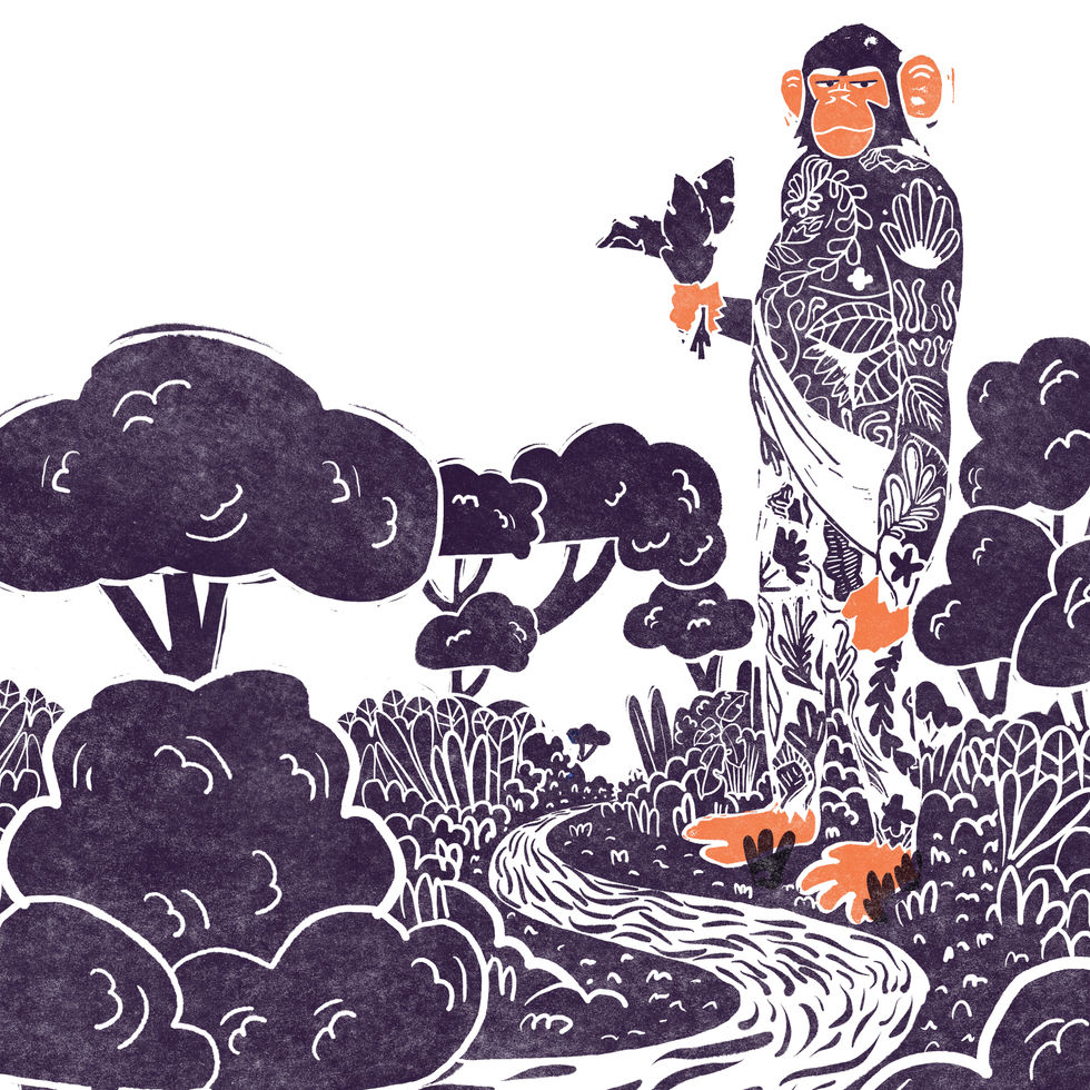 Pour illustrer un article sur le biomimetisme, j’ai choisi de représenter un chimpanzé géant dans la forêt en mixant techniques, numérique et manuel (linogravure et Procreate).